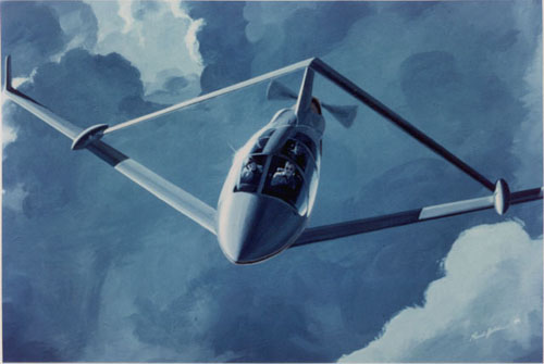 In joined-wing designs (below) the horizontal tail sweeps forward and joins the main wing, forming a strut. The tail is then in compression, reducing wing bending moments. If the tail is large enough to be positively loaded, some induced drag savings is achieved, while if it is carrying a down-load, the closed loop feature of the system minimizes trim drag. The concept was proposed by Dr. Julian Wolkovitch, who conducted numerous system studies, wind tunnel, and flight tests of the concept. (See references.) He envisioned applications for general aviation (see figure below), UAV's, and commercial aircraft. It has been studied by Boeing as a radar platform and by NASA for application to medium range transports.